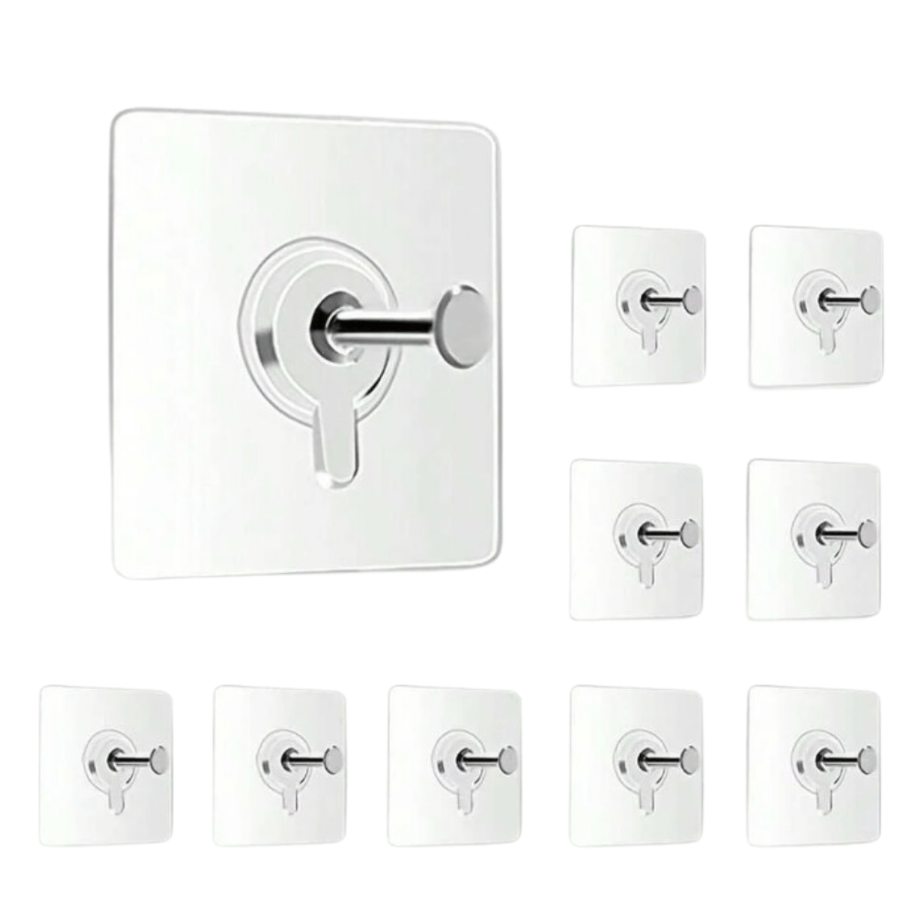 Set de 20 ganchos colgadores adhesivos multiuso, perfectos para organizar espacios en el hogar u oficina. Fabricados en cloruro de polivinilo (PVC) transparente de alta calidad, combinan resistencia y discreción en cualquier decoración.