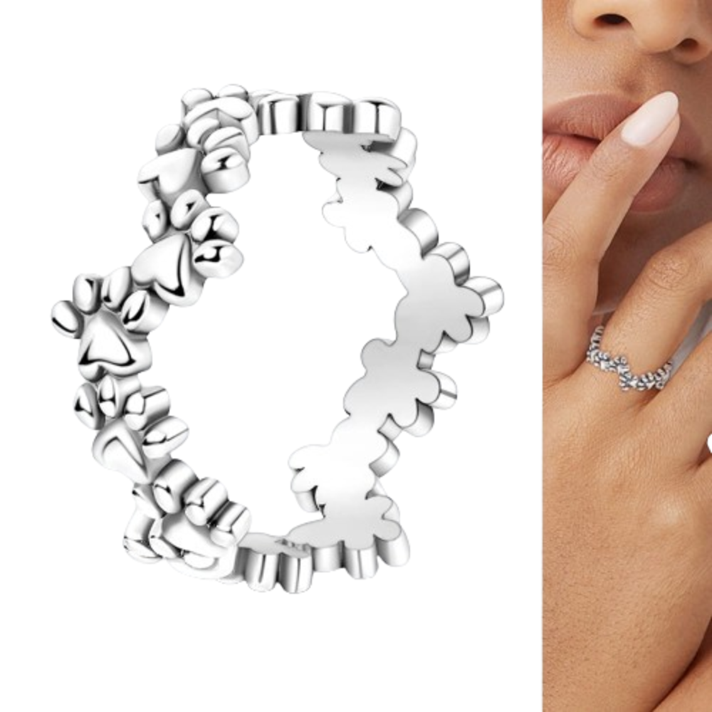 Expresa tu amor por los peludos con nuestro anillo para mujer, anillo bañado en plata 925, modelo Footprints. Este encantador anillo presenta delicadas huellitas de perro, capturando la ternura y lealtad de tus compañeros de cuatro patas.