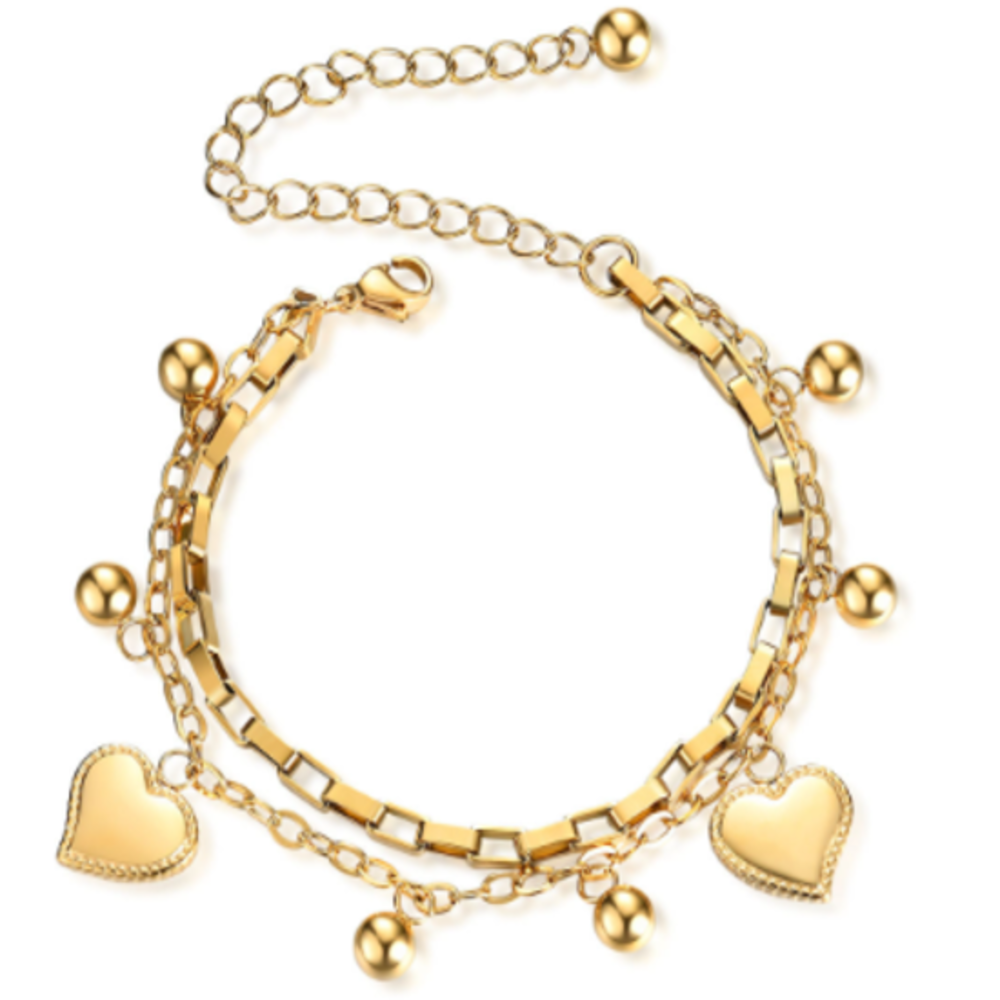 Pulsera Dorada Multicapa para Mujer con dijes bañado en Oro, cadena fígaro de doble capa. Marca: EC. Metales: Acero inoxidable, Oro 18k. Forma/patrón: Corazón. Cierre: Langosta. Longitud: 17+5cm. Tamaño del encanto: 14mm. Tamaño de cuentas: 5mm. Proceso: Pulido espejo de alta calidad. Hipoalergénico: sí.